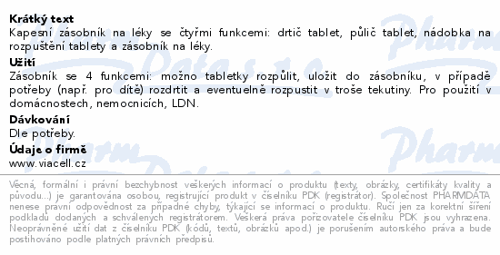 Kapesní zásobník na léky se čtyřmi funkcemi: drtič tablet, půlič tablet, nádobka na rozpuštění tablety a zásobník na léky.