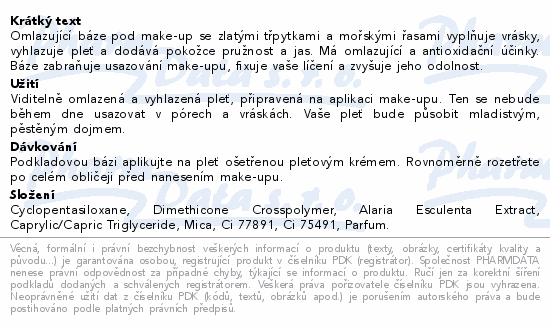Omlazující báze pod make-up se zlatými třpytkami a mořskými řasami vyplňuje vrásky, vyhlazuje pleť a dodává pokožce pružnost a jas. Má omlazující a antioxidační účinky. Báze zabraňuje usazování make-upu, fixuje vaše líčení a zvyšuje jeho odolnost.