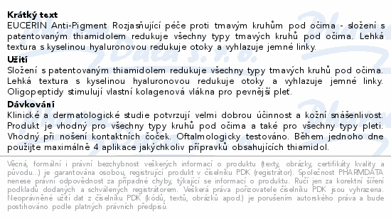 EUCERIN Anti-Pigment Rozjasňující péče proti tmavým kruhům pod očima - složení s patentovaným thiamidolem redukuje všechny typy tmavých kruhů pod očima. Lehká textura s kyselinou hyaluronovou redukuje otoky a vyhlazuje jemné linky.