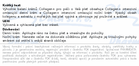 Výhodné balení krémů Collagen+ pro péči o Vaši pleť obsahuje Collagen+ intenzivní omlazující denní krém a Collagen+ intenzivní omlazující noční krém. Vysoký obsah kolagenu a extraktu z mořských řas pleť vypíná a obnovuje její pružnost a svěžest.