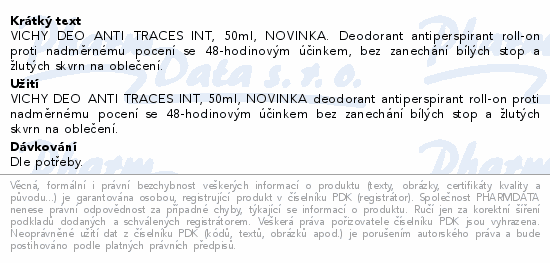 VICHY DEO ANTI TRACES INT, 50ml. Antiperspirant roll-on proti nadměrnému pocení se 48-hodinovým účinkem, bez zanechání bílých stop a žlutých skvrn na oblečení.