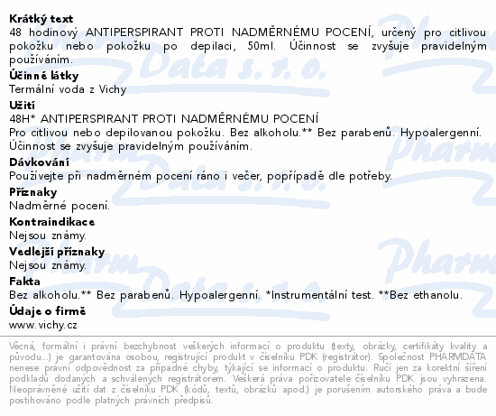 Složení speciálně navržené pro citlivou a depilovanou pokožku. Obohacený o zklidňující složky. Bez alkoholu. S Mineralizující termální vodou Vichy. Až 48h ochrana pro citlivou a depilovanou pokožku. Obohaceno o výtažek z bílého leknínu, který zklidňuje pokožku.