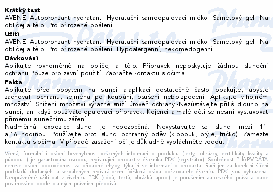 AVENE Autobronzant hydratant. Hydratační samoopalovací mléko. Sametový gel. Na obličej a tělo. Pro přirozené opálení.