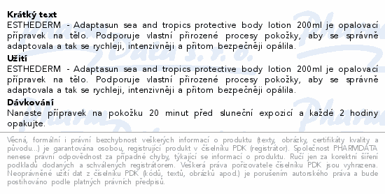 ESTHEDERM - Adaptasun sea and tropics protective body lotion 200ml je opalovací přípravek na tělo. Podporuje vlastní přirozené procesy pokožky, aby se správně adaptovala a tak se rychleji, intenzivněji a přitom bezpečněji opálila.