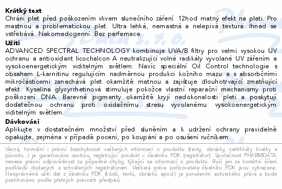 Chrání pleť před poškozením vlivem slunečního záření. 12hod matný efekt na pleti. Pro mastnou a problematickou pleť. Ultra lehká, nemastná a nelepivá textura. Ihned se vstřebává. Nekomedogenní. Bez parfemace.