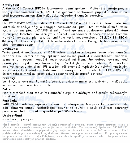LA ROCHE-POSAY ANTHELIOS Oil Correct SPF50+ 50ml je fotokorekční denní gel-krém s velmi vysokou sluneční ochranou, speciálně vyvinutý pro mastnou a problematickou pleť se sklonem k akné, pro pleť s rozšířenými póry a nedokonalostmi a jako každodenní ochrana před sluncem a prevence fotostárnutí. Textura je ultralehká, nemastná, rychle se vstřebává a zanechává pleť matnou až po dobu 12 hodin. Přípravek je nekomedogenní, hypoalergenní a testovaný na citlivé a aknózní pleti pod dermatologickým dohledem. Obsahuje Technologii CELLOX-B3 TECH™ - tento patentovaný komplex kombinuje pokročilé UV filtry (např. Mexoryl XL) s antioxidanty (vitamíny E a B3 - Niacinamid) a Termální vodou z La Roche-Posay. Dále obsahuje dermatologicky aktivní látky, které se zaměřují na problémy mastné a aknózní pleti - Kyselinu salicylovou a Niacinamid (Vitamin B3).