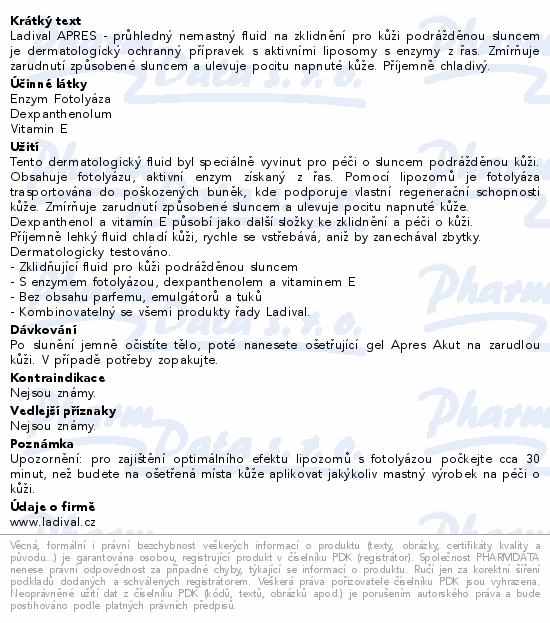 Ladival APRES - průhledný nemastný fluid na zklidnění pro kůži podrážděnou sluncem je dermatologický ochranný přípravek s aktivními liposomy s enzymy z řas. Zmírňuje zarudnutí způsobené sluncem a ulevuje pocitu napnuté kůže. Příjemně chladivý.