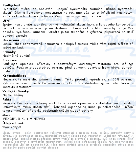VICHY Idéal Soleil Mléko po opalování je zklidňující a hydratační péče určená pro pokožku vystavenou slunci, včetně citlivé. Mléko je vhodné pro každodenní použití po opalování jak na tělo, tak na obličej. Přípravek obsahuje termální vodu Vichy, která je bohatá na minerály a známá svými zklidňujícími, posilujícími a regeneračními účinky. Dále je obohacen o glycerin a rostlinné oleje, které pomáhají obnovit kožní bariéru, intenzivně hydratují pokožku až po dobu 24 hodin a zmírňují pocit napětí, suchosti nebo přehřátí. Lehká mléčná textura se rychle vstřebává, nezanechává mastný film ani lepkavý pocit a poskytuje okamžitý chladivý efekt. Přípravek je hypoalergenní, dermatologicky testovaný a bez parabenů a tím vhodný i pro osoby s citlivou pokožkou. VICHY Idéal Soleil After Sun pomáhá prodlužovat opálení, regenerovat pokožku a obnovit její komfort po slunění. Aplikuje se na čistou a suchou pokožku po každém pobytu na slunci.