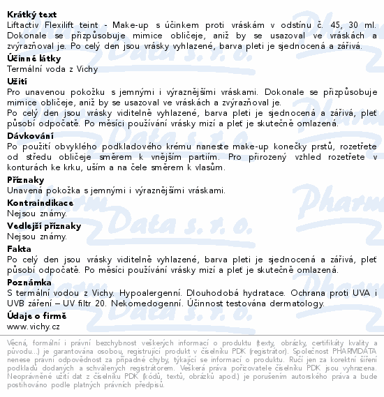 Liftactiv Flexilift teint - Make-up s účinkem proti vráskám v odstínu č. 45, 30 ml. Dokonale se přizpůsobuje mimice obličeje, aniž by se usazoval ve vráskách a zvýrazňoval je. Po celý den jsou vrásky vyhlazené, barva pleti je sjednocená a zářivá.