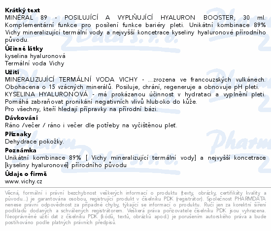 MINÉRAL 89 - POSILUJÍCÍ A VYPLŇUJÍCÍ HYALURON BOOSTER, 30 ml. Komplementární funkce pro posílení funkce bariéry pleti. Unikátní kombinace 89% Vichy mineralizující termální vody a nejvyšší koncetrace kyseliny hyaluronové přírodního původu.