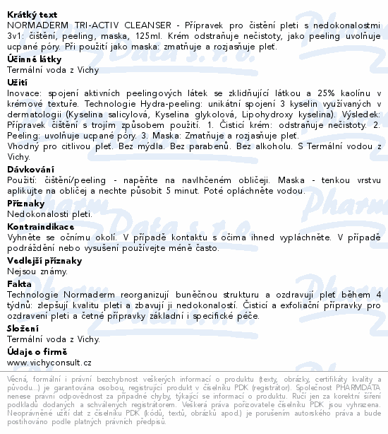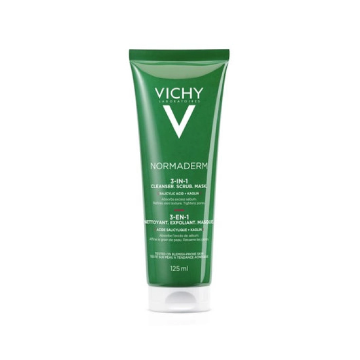 Vichy Normaderm čištění 3v1 - Přípravek pro čistění pleti s nedokonalostmi: čištění, peeling, maska, 125ml. Krém odstraňuje nečistoty, jako peeling uvolňuje ucpané póry. Při použití jako maska: zmatňuje a rozjasňuje pleť.