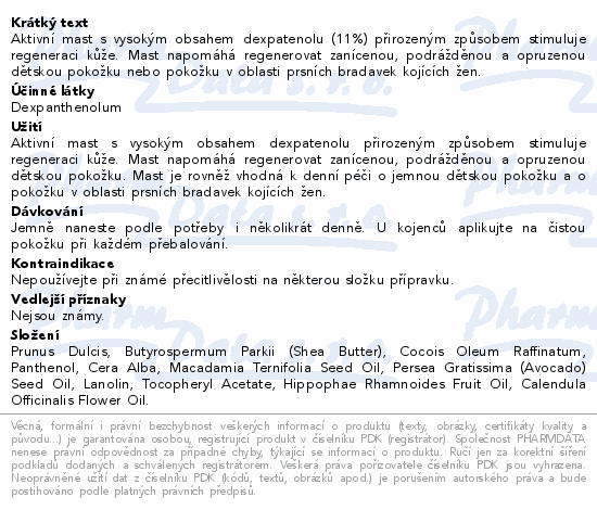 Aktivní mast s vysokým obsahem dexpatenolu (11%) přirozeným způsobem stimuluje regeneraci kůže. Mast napomáhá regenerovat zanícenou, podrážděnou a opruzenou dětskou pokožku nebo pokožku v oblasti prsních bradavek kojících žen.