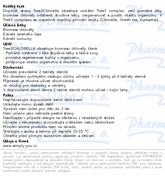 Doplněk stravy Tree3Chlorella obsahuje unikátní Tree3 complex, jenž pomáhá díky biomase chlorelly odstranit škodlivé látky, zregenerovat a posílit vitalitu organizmu. V Tree3 complexu se vzájemně doplňují přírodní složky (Chlorella, Green tea, Kurkumin).