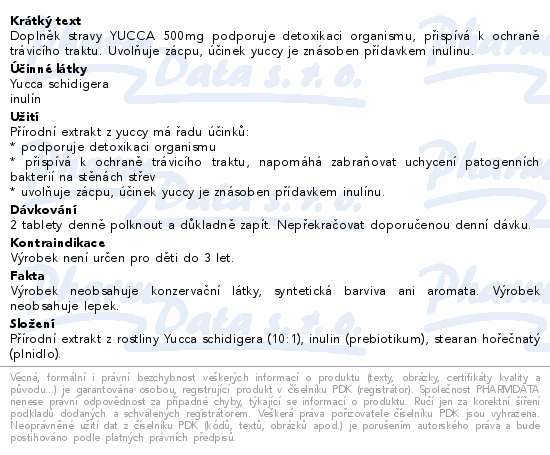 Doplněk stravy YUCCA 500mg podporuje detoxikaci organismu, přispívá k ochraně trávicího traktu. Uvolňuje zácpu, účinek yuccy je znásoben přídavkem inulinu.