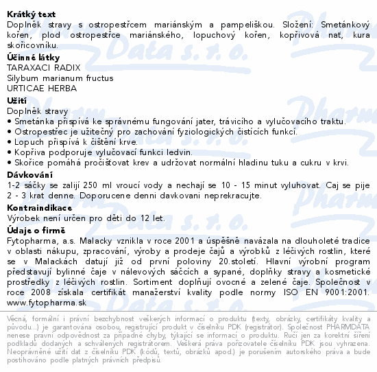 Doplněk stravy s ostropestřcem mariánským a pampeliškou. Složení: Smetánkový kořen, plod ostropestřce mariánského, lopuchový kořen, kopřivová nať, kura skořicovníku.