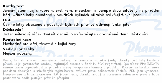 Jančův jaterní čaj s koprem, světlíkem, měsíčkem a pampeliškou založený na přírodní bázi. Účinné látky obsažené v použitých bylinách příznivě ovlivňuji funkci jater.
