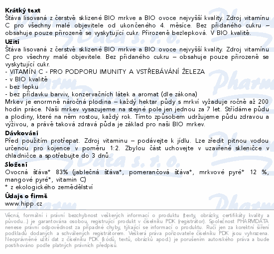 Šťáva lisovaná z čerstvě sklizené BIO mrkve a BIO ovoce nejvyšší kvality. Zdroj vitamínu C pro všechny malé objevitele od ukončeného 4. měsíce. Bez přidaného cukru – obsahuje pouze přirozeně se vyskytující cukr. Přirozeně bezlepková. V BIO kvalitě.