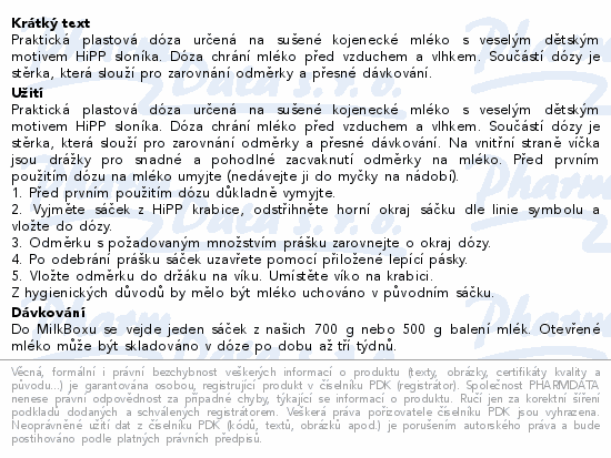 Praktická plastová dóza určená na sušené kojenecké mléko s veselým dětským motivem HiPP sloníka. Dóza chrání mléko před vzduchem a vlhkem. Součástí dózy je stěrka, která slouží pro zarovnání odměrky a přesné dávkování.
