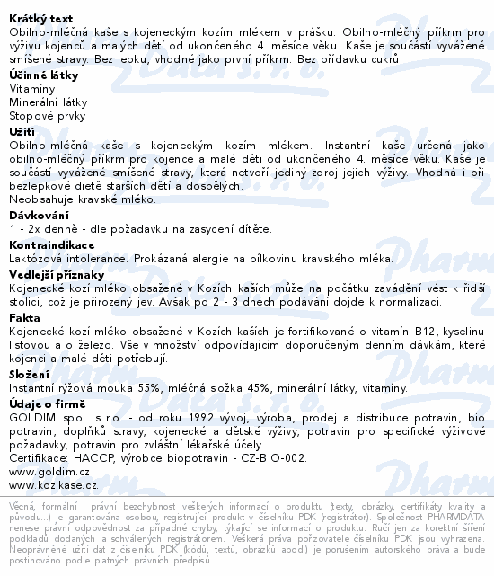 Obilno-mléčná kaše s kojeneckým kozím mlékem v prášku. Obilno-mléčný příkrm pro výživu kojenců a malých dětí od ukončeného 4. měsíce věku. Kaše je součástí vyvážené smíšené stravy. Bez lepku, vhodné jako první příkrm. Bez přídavku cukrů.