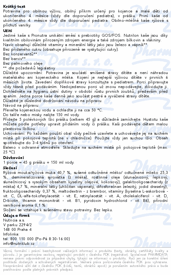 Potravina pro obilnou výživu, obilný příkrm určený pro kojence a malé děti od ukončeného 4. měsíce (vždy dle doporučení pediatra), v prášku. První kaše od ukončeného 4. měsíce vždy dle doporučení pediatra. Obilno-mléčná kaše rýžová s příchutí vanilky.