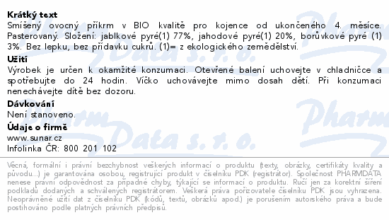 Smíšený ovocný příkrm v BIO kvalitě pro kojence od ukončeného 4. měsíce. Pasterovaný. Složení: jablkové pyré(1) 77%, jahodové pyré(1) 20%, borůvkové pyré (1) 3%. Bez lepku, bez přídavku cukrů. (1)= z ekologického zemědělství.