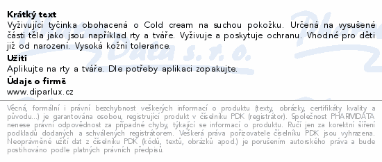 Vyživující tyčinka obohacená o Cold cream na suchou pokožku. Určená na vysušené části těla jako jsou například rty a tváře. Vyživuje a poskytuje ochranu. Vhodné pro děti již od narození. Vysoká kožní tolerance.