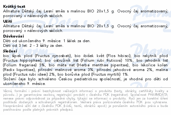 Allnature Dětský čaj Lesní směs s malinou BIO 20x1,5 g. Ovocný čaj aromatizovaný, porcovaný v nálevových sáčcích.