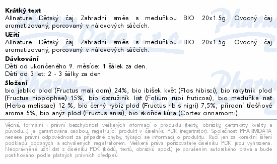 Allnature Dětský čaj Zahradní směs s meduňkou BIO 20x1.5g. Ovocný čaj aromatizovaný, porcovaný v nálevových sáčcích.