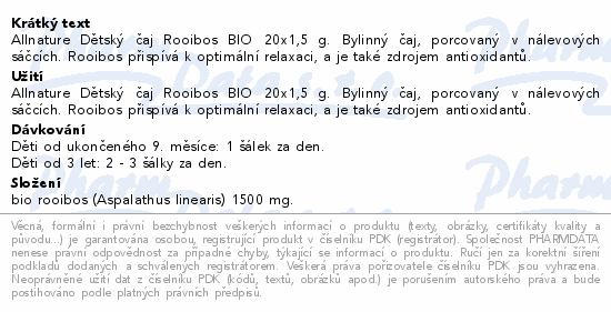 Allnature Dětský čaj Rooibos BIO 20x1,5 g. Bylinný čaj, porcovaný v nálevových sáčcích. Rooibos přispívá k optimální relaxaci, a je také zdrojem antioxidantů.