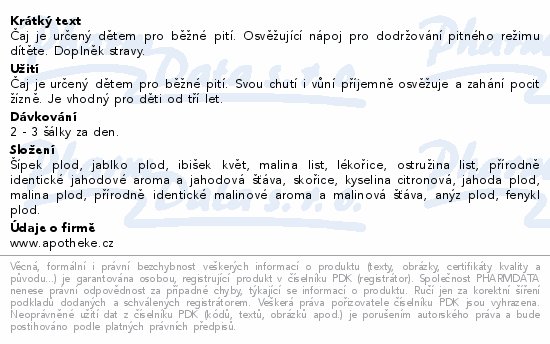Čaj je určený dětem pro běžné pití. Osvěžující nápoj pro dodržování pitného režimu dítěte. Doplněk stravy.
