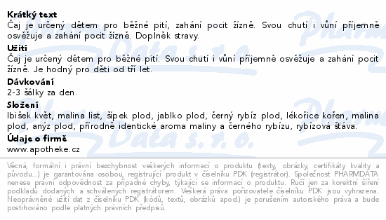 Čaj je určený dětem pro běžné pití, zahání pocit žízně. Svou chutí i vůní příjemně osvěžuje a zahání pocit žízně. Doplněk stravy.