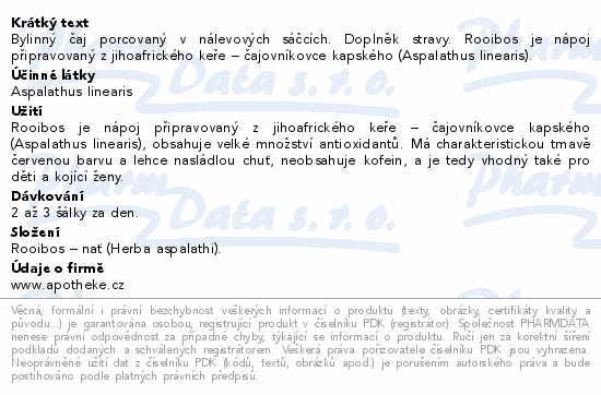Bylinný čaj porcovaný v nálevových sáčcích. Doplněk stravy. Rooibos je nápoj připravovaný z jihoafrického keře – čajovníkovce kapského (Aspalathus linearis).