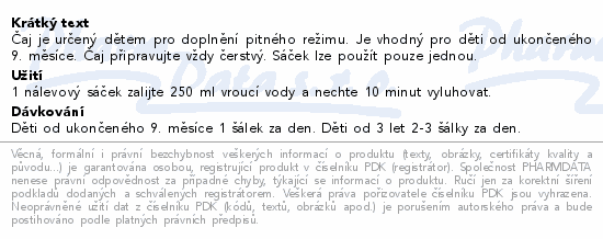 Čaj je určený dětem pro doplnění pitného režimu. Je vhodný pro děti od ukončeného 9. měsíce. Čaj připravujte vždy čerstvý. Sáček lze použít pouze jednou.