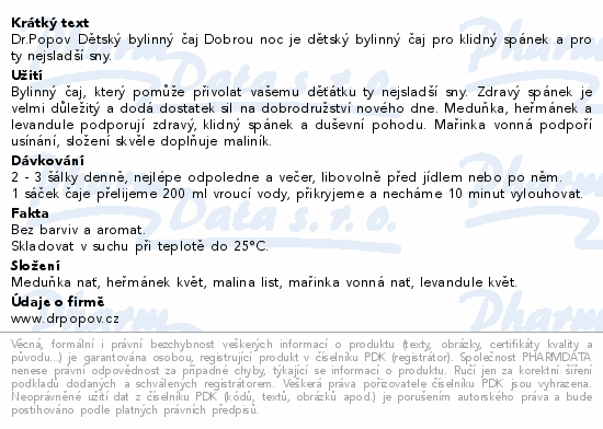 Dr.Popov Dětský bylinný čaj Dobrou noc je dětský bylinný čaj pro klidný spánek a pro ty nejsladší sny.