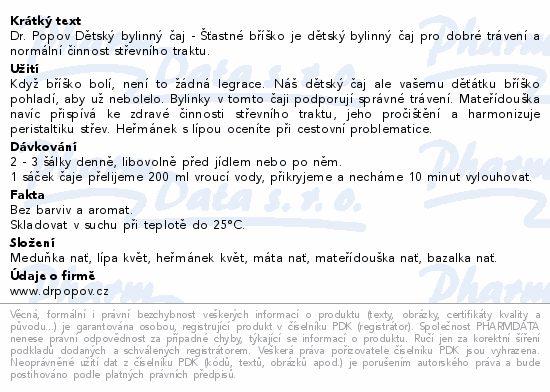 Dr. Popov Dětský bylinný čaj - Šťastné bříško je dětský bylinný čaj pro dobré trávení a normální činnost střevního traktu.
