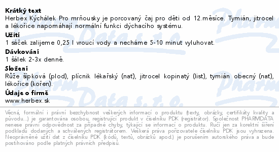Herbex Kýchálek Pro mrňousky je porcovaný čaj pro děti od 12.měsíce. Tymián, jitrocel a lékořice napomáhají normální funkci dýchacího systému.