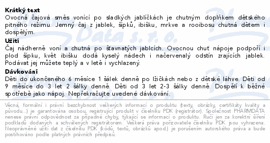 Ovocná čajová směs vonící po sladkých jablíčkách je chutným doplňkem dětského pitného režimu. Jemný čaj z jablek, šípků, ibišku, mrkve a rooibosu chutná dětem i dospělým.