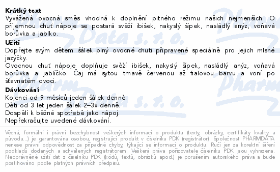 Vyvážená ovocná směs vhodná k doplnění pitného režimu našich nejmenších. O příjemnou chuť nápoje se postará svěží ibišek, nakyslý šípek, nasládlý anýz, voňavá borůvka a jablko.