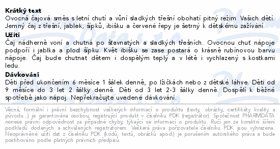 Ovocná čajová směs s letní chutí a vůní sladkých třešní obohatí pitný režim Vašich dětí. Jemný čaj z třešní, jablek, šípků, ibišku a červené řepy je šetrný k dětskému zažívání.