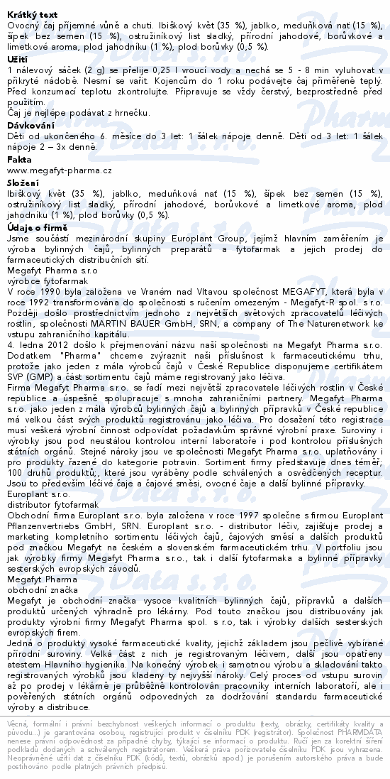 Ovocný čaj příjemné vůně a chuti. Ibiškový květ (35 %), jablko, meduňková nať (15 %), šípek bez semen (15 %), ostružiníkový list sladký, přírodní jahodové, borůvkové a limetkové aroma, plod jahodníku (1 %), plod borůvky (0,5 %).