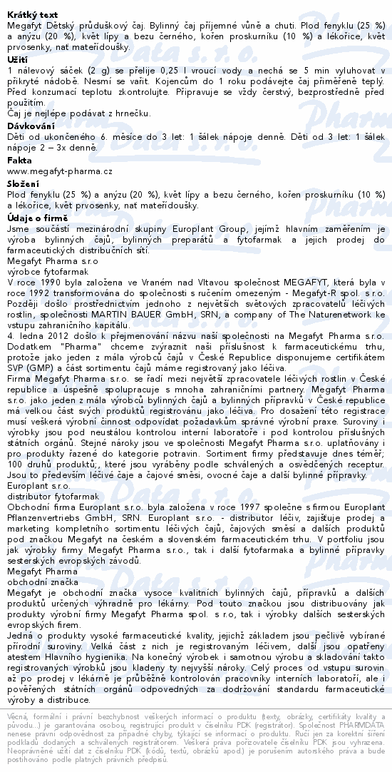 Megafyt Dětský průduškový čaj. Bylinný čaj příjemné vůně a chuti. Plod fenyklu (25 %) a anýzu (20 %), květ lípy a bezu černého, kořen proskurníku (10 %) a lékořice, květ prvosenky, nať mateřídoušky.