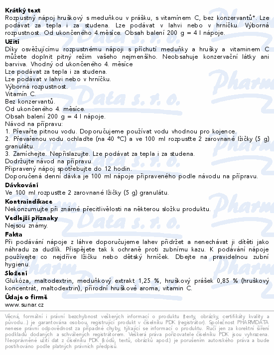 Rozpustný nápoj hruškový s meduňkou v prášku, s vitamínem C, bez konzervantů*. Lze podávat za tepla i za studena. Lze podávat v lahvi nebo v hrníčku. Výborná rozpustnost. Od ukončeného 4.měsíce. Obsah balení 200 g = 4 l nápoje.