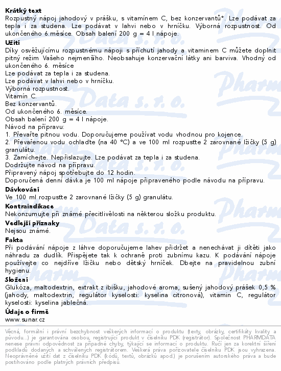 Rozpustný nápoj jahodový v prášku, s vitamínem C, bez konzervantů*. Lze podávat za tepla i za studena. Lze podávat v lahvi nebo v hrníčku. Výborná rozpustnost. Od ukončeného 6.měsíce. Obsah balení 200 g = 4 l nápoje.