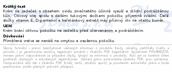 Krém na zadeček s obsahem oxidu zinečnatého účinně vysuší a zklidní podrážděnou kůži. Olivový olej spolu s dalšími tukovými složkami pokožku příjemně zvláční. Další složky vitamin E, D-pantenol a heřmánkový extrakt májí příznivý vliv na vitalitu buněk.