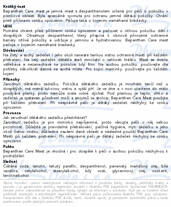 Bepanthen Care mast je jemná mast s dexpanthenolem určená pro péči o pokožku v plenkové oblasti. Byla speciálně vyvinuta pro ochranu jemné dětské pokožky. Chrání před příčinami vzniku opruzenin. Pečuje také o kojením namáhané bradavky.