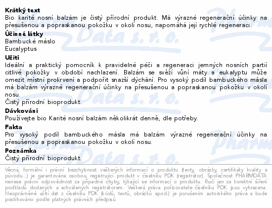 Bio karité nosní balzám je čistý přírodní produkt. Má výrazné regenerační účinky na přesušenou a popraskanou pokožku v okolí nosu, napomáhá její rychlé regeneraci.