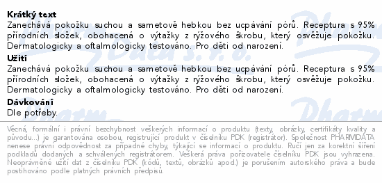 Zanechává pokožku suchou a sametově hebkou bez ucpávání pórů. Receptura s 95% přírodních složek, obohacená o výtažky z rýžového škrobu, který osvěžuje pokožku. Dermatologicky a oftalmologicky testováno. Pro děti od narození.