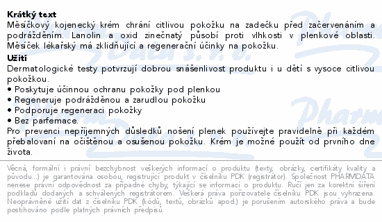 Měsíčkový kojenecký krém chrání citlivou pokožku na zadečku před začervenáním a podrážděním. Lanolin a oxid zinečnatý působí proti vlhkosti v plenkové oblasti. Měsíček lékařský má zklidňující a regenerační účinky na pokožku.