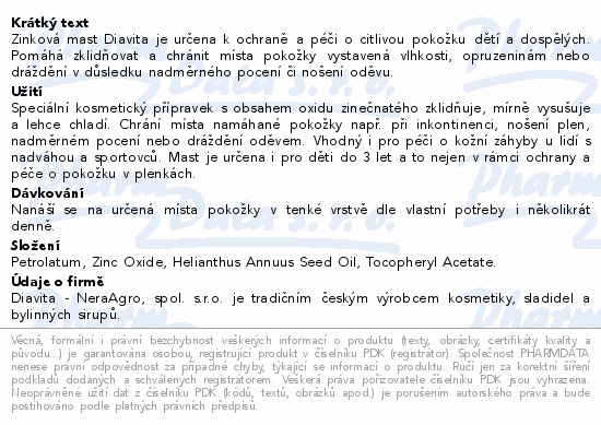 Zinková mast Diavita je určena k ochraně a péči o citlivou pokožku dětí a dospělých. Pomáhá zklidňovat a chránit místa pokožky vystavená vlhkosti, opruzeninám nebo dráždění v důsledku nadměrného pocení či nošení oděvu.