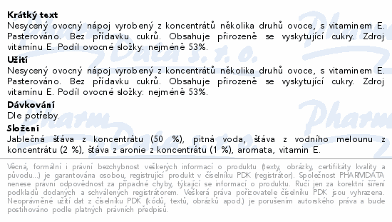 Nesycený ovocný nápoj vyrobený z koncentrátů několika druhů ovoce, s vitaminem E. Pasterováno. Bez přídavku cukrů. Obsahuje přirozeně se vyskytující cukry. Zdroj vitamínu E. Podíl ovocné složky: nejméně 53%.